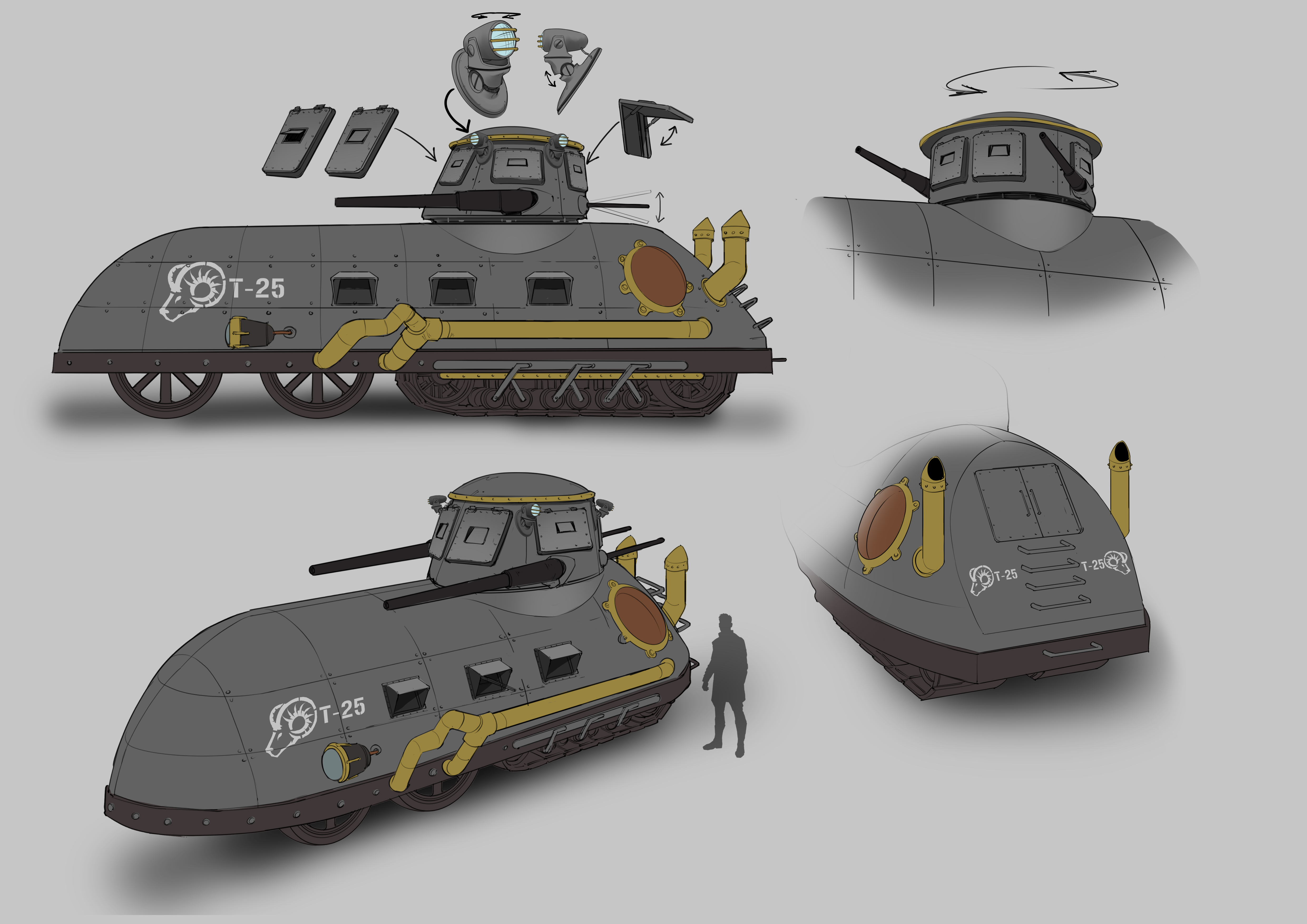 It was manufactured by the now defunct “ForgeIron” company who produced a wide range of steam-powered farm implements before the Baker-Craine buyout. They won the much-coveted contract of unifying the disparate combat transport platforms that were plaguing the Cardinal Knights' logistics department. ForgeIron’s philosophy was to put the same level of dependability in their first military tank as they did their tractors so that the operators knew they could count on the vehicle when it mattered most. And that they did. The design was built on their most famous and dependable model, the FI Type-27 farm tractor, and branded the “Terrapin” to reflect its substantial armor.